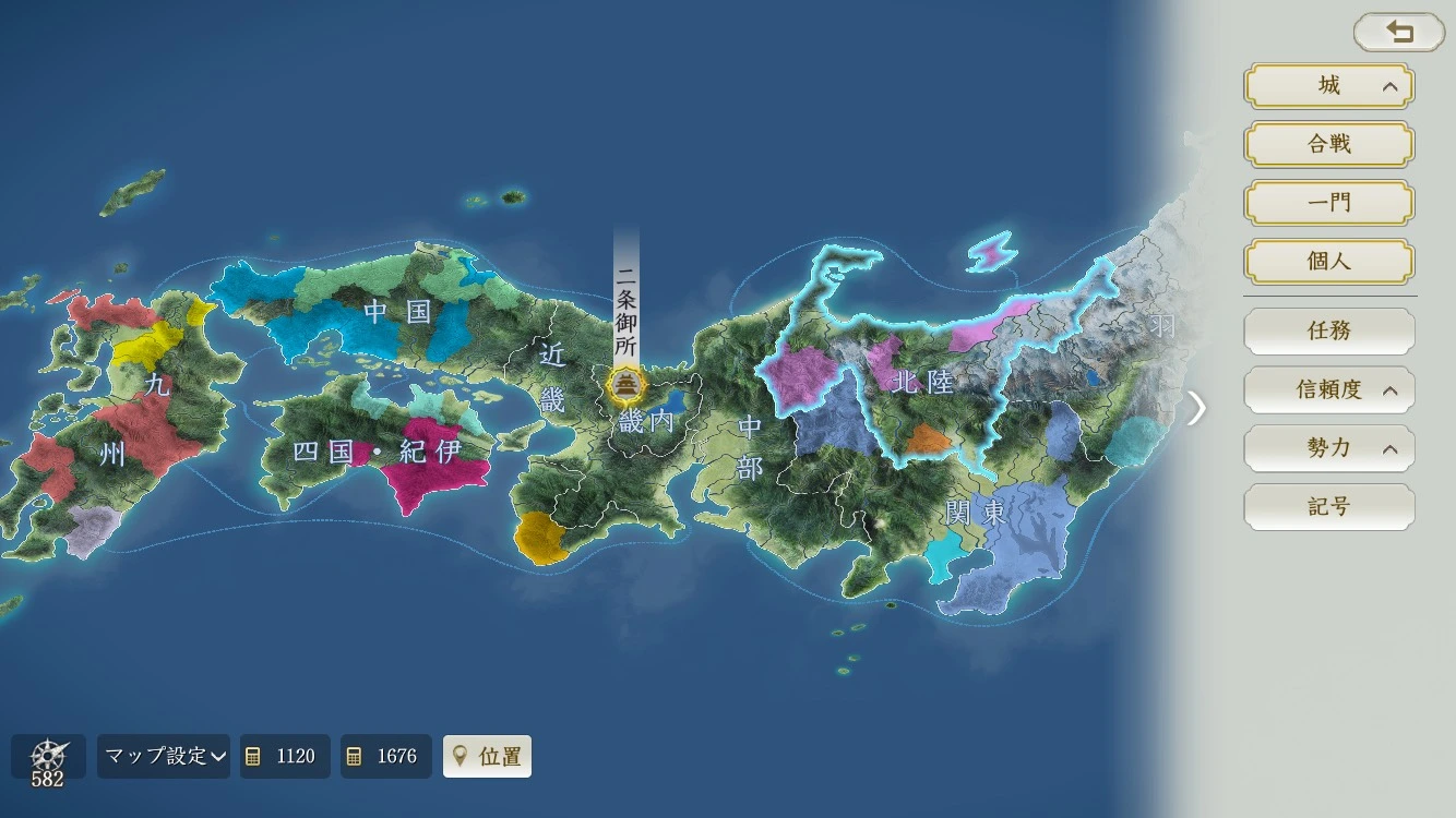 本作のマップは単なる背景ではなく、戦略そのものに深く関わってきます。山地や河川、関所といった地形が進軍ルートを制限し、防衛側に有利に働く場面も多く存在します。どこに拠点を構えるか、どのルートを押さえるかによって、同じ戦力でも展開が大きく変わります。