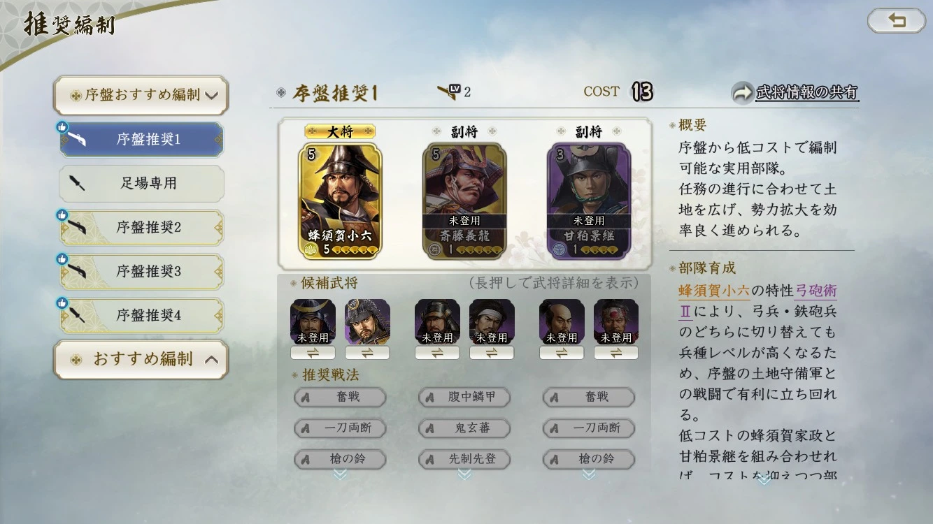 序盤から高レア武将だけで固めようとすると、育成素材が足りず中途半端になりがちです。そのため、星3・星4武将を中心に育てるのが現実的な選択となります。これらの武将は育成コストが低く、戦法との組み合わせ次第で十分な戦力になります。